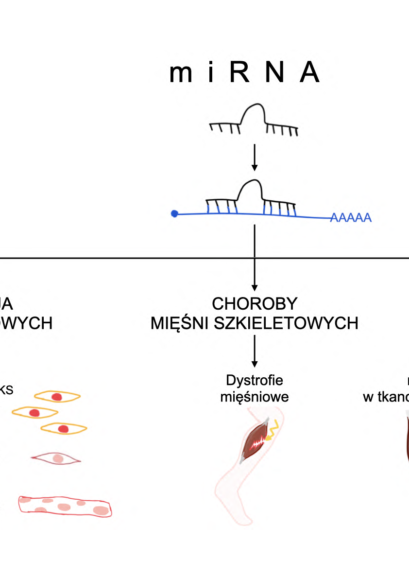 MikroRNA (miRNA) nie kodują białek, a jednak odgrywają ogromną rolę w wielu procesach biologicznych, w tym w rozwoju i regeneracji mięśni szkieletowych. miRNA regulują procesy zachodzące w trakcie rekonstrukcji mięśni, począwszy od utrzymywania komórek satelitowych w stanie spoczynkowym, przez ich aktywację, proliferację i różnicowanie w mioblasty, aż po fuzję tych komórek prowadzącą do powstania miotub. miRNA wpływają także na przebieg chorób degeneracyjnych mięśni szkieletowych, a ich poziom jest zmieniony w stanach chorobowych. Z tego powodu uważa się, że mogą być wykorzystane jako biomarkery chorób lub nawet cele terapeutyczne. Co ciekawe, aktywność fizyczna również wpływa na zmiany poziomu miRNA w tkance mięśniowej oraz krwiobiegu. Obserwowane różnice w profilach ekspresji tych cząsteczek są zależne od rodzaju, czasu trwania oraz intensywności treningu.